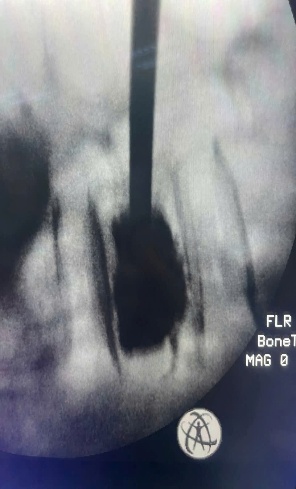 Bơm ciment sinh học điều trị xẹp đốt sống do loãng xương, trên màn hình tăng sáng ( máy C-Arm) |