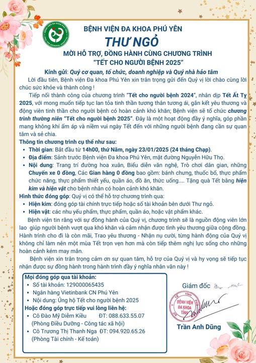 Một mùa xuân mới đang cận kề, mang theo bao niềm vui và hy vọng. Thế nhưng, tại Bệnh viện Đa khoa Phú Yên, vẫn còn những bệnh nhân kém may mắn đang từng ngày chiến đấu với bệnh tật. Với mong muốn mang lại không khí ấm áp, sẻ chia và động viên tinh thần cho những hoàn cảnh khó khăn, Bệnh viện sẽ tổ chức chương trình thường niên “Tết cho người bệnh 2025” – một hoạt động đầy ý nghĩa thường niên.