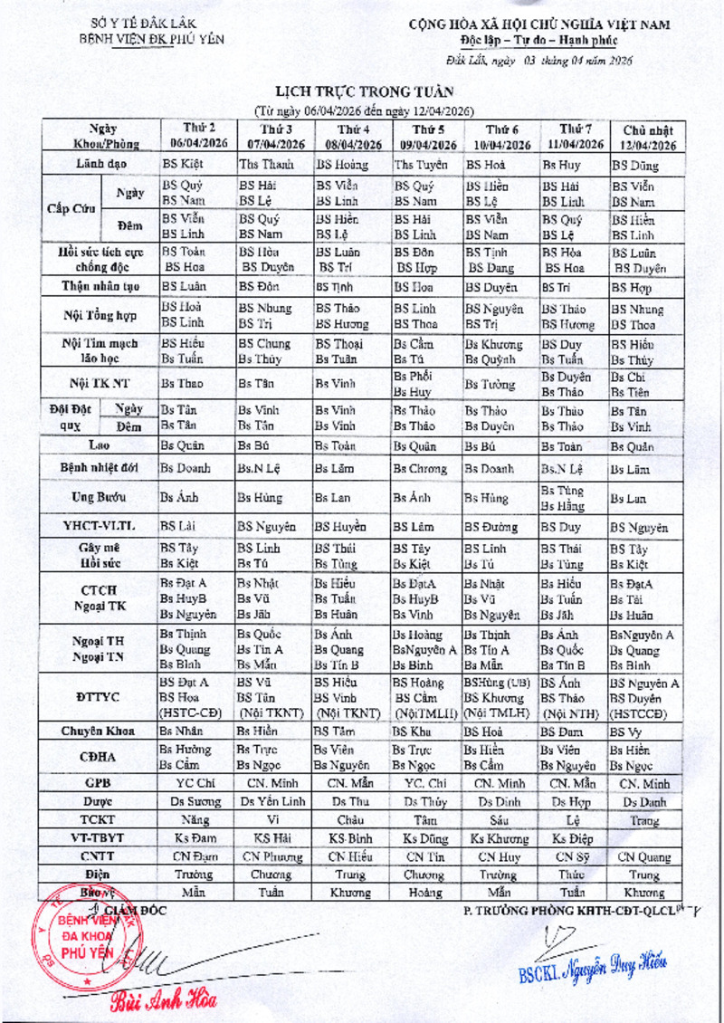 | Tiêu đề văn bản | Lịch trực trong tuần (từ ngày 06/4/2026 đến ngày 12/4/2026) | ||