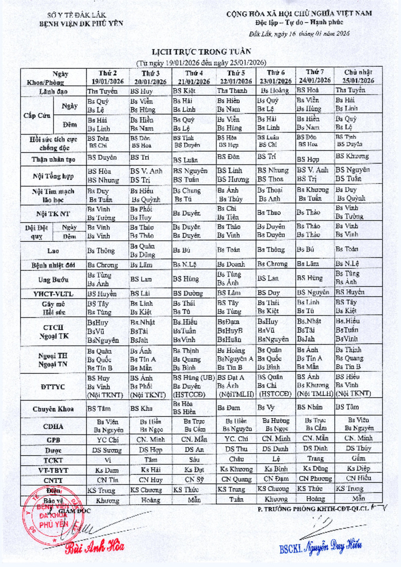 | Tiêu đề văn bản | Lịch trực trong tuần ( từ ngày 19/01/2026 đến ngày 25/01/2026) | ||
