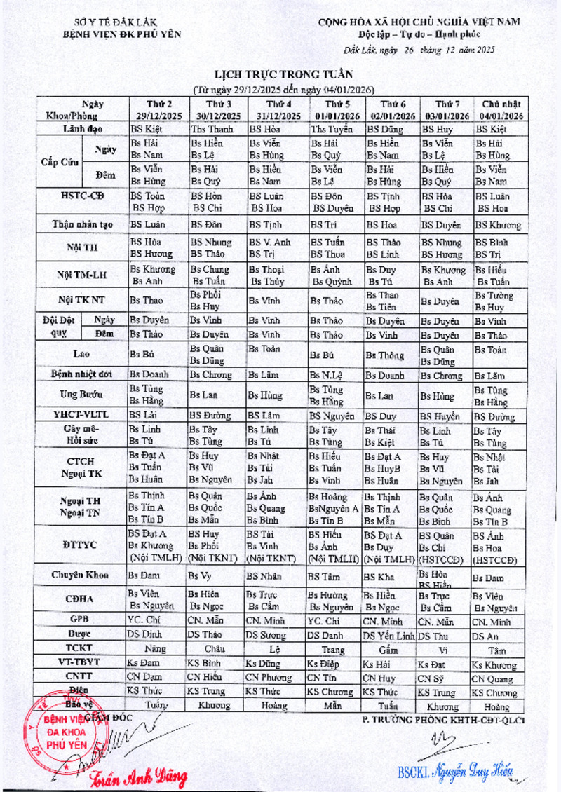 | Tiêu đề văn bản | Lịch trực trong tuần (từ ngày 29/12/2025 đến ngày 04/04/2026 ) | ||