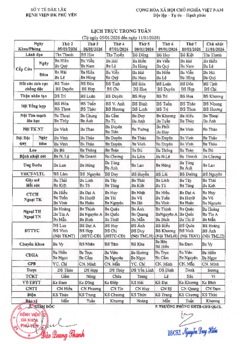 | Tiêu đề văn bản | Lịch trực tuần (Từ ngày 05/01/2026 đến ngày 11/01/2026) | ||