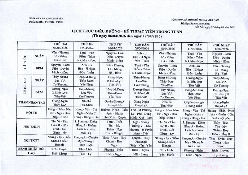 | Tiêu đề văn bản | Lịch trực Điều dưỡng - Kỹ thuật viên ( Từ ngày 06/4/2026 đến ngày 12/4/2026) | ||