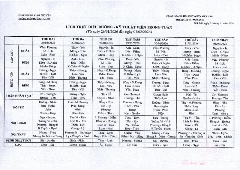 | Tiêu đề văn bản | Lịch trực Điều dưỡng - Kỹ thuật viên ( Từ ngày 26/01/2026 đến ngày 01/02/2026) | ||
