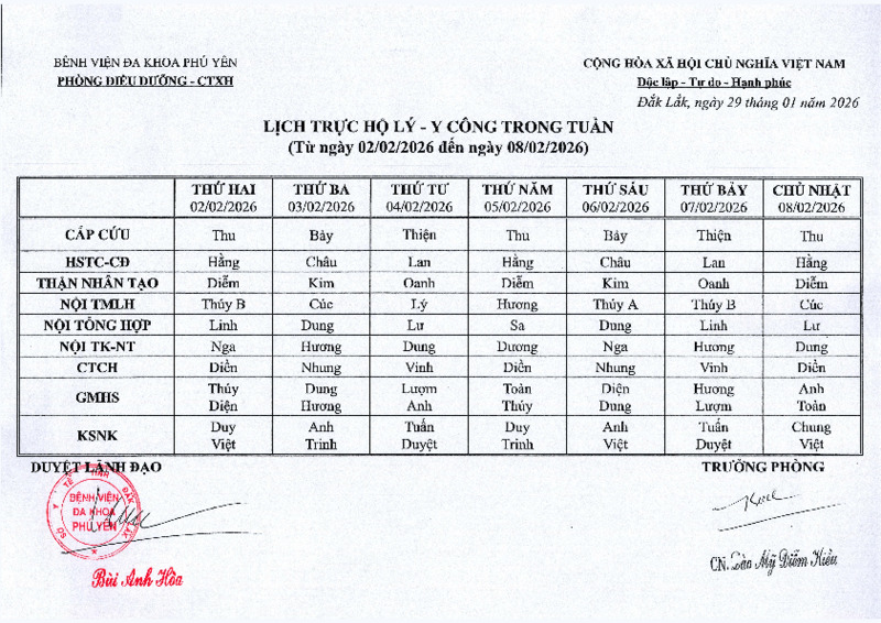 | Tiêu đề văn bản | Lịch trực Hộ lý - Y công ( Từ ngày 02/02/2025 đến ngày 08/02/2025) | ||