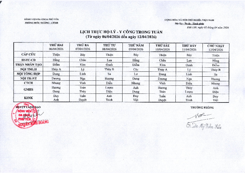 | Tiêu đề văn bản | Lịch trực Hộ lý - Y công ( Từ ngày 06/4/2026 đến ngày 12/4/2026) | ||