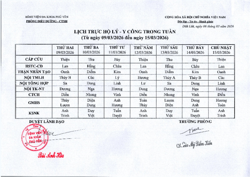 | Tiêu đề văn bản | Lịch trực Hộ lý - Y công ( Từ ngày 09/03/2026 đến ngày 15/03/2026) | ||