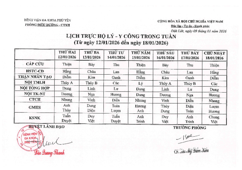 | Tiêu đề văn bản | Lịch trực Hộ lý - Y công ( Từ ngày 12/01/2025 đến ngày 18/01/2025) | ||