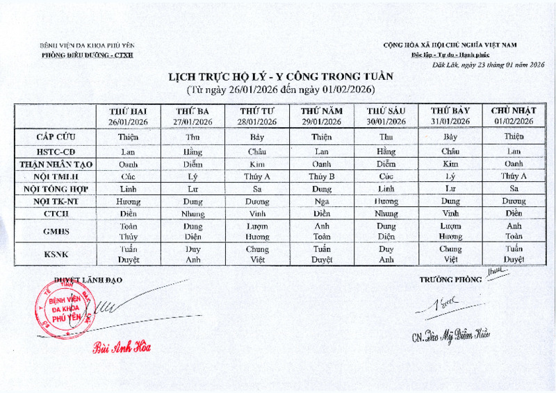| Tiêu đề văn bản | Lịch trực Hộ lý - Y công ( Từ ngày 26/01/2025 đến ngày 01/02/2025) | ||
