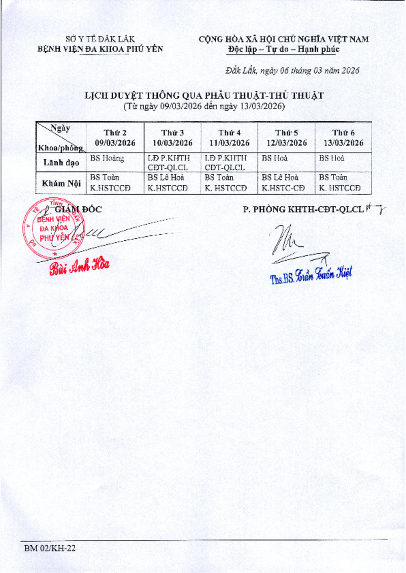 | Tiêu đề văn bản | Lịch duyệt thông qua Phẫu thuật - Thủ thuật (Từ ngày 09/03/2026 đến ngày 15/03/2026) | ||