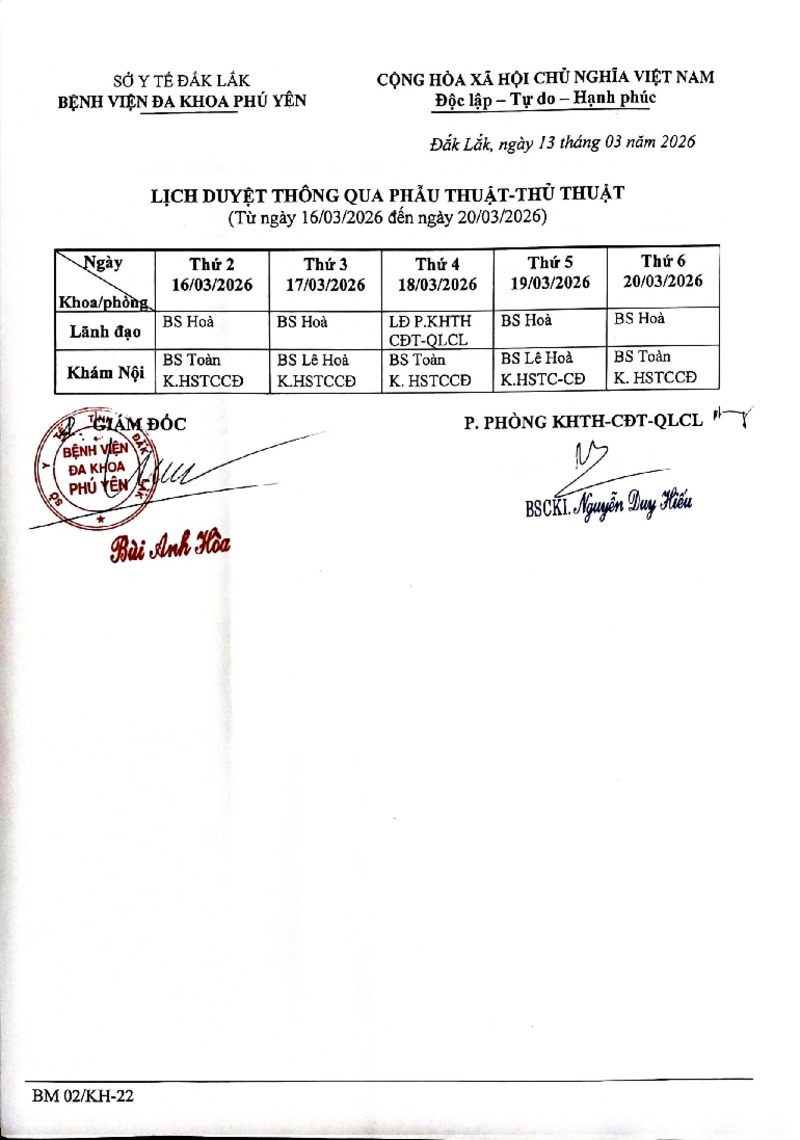 | Tiêu đề văn bản | Lịch duyệt thông qua Phẫu thuật - Thủ thuật (từ ngày 16/03/2026 đến ngày 22/03/2026) | ||
