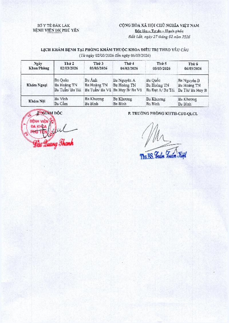 | Tiêu đề văn bản | Lịch khám bệnh tại phòng khám thuộc Khoa Điều Trị Theo Yêu Cầu ( Từ ngày 02/03/2026 đến ngày 06/03/2026) | ||