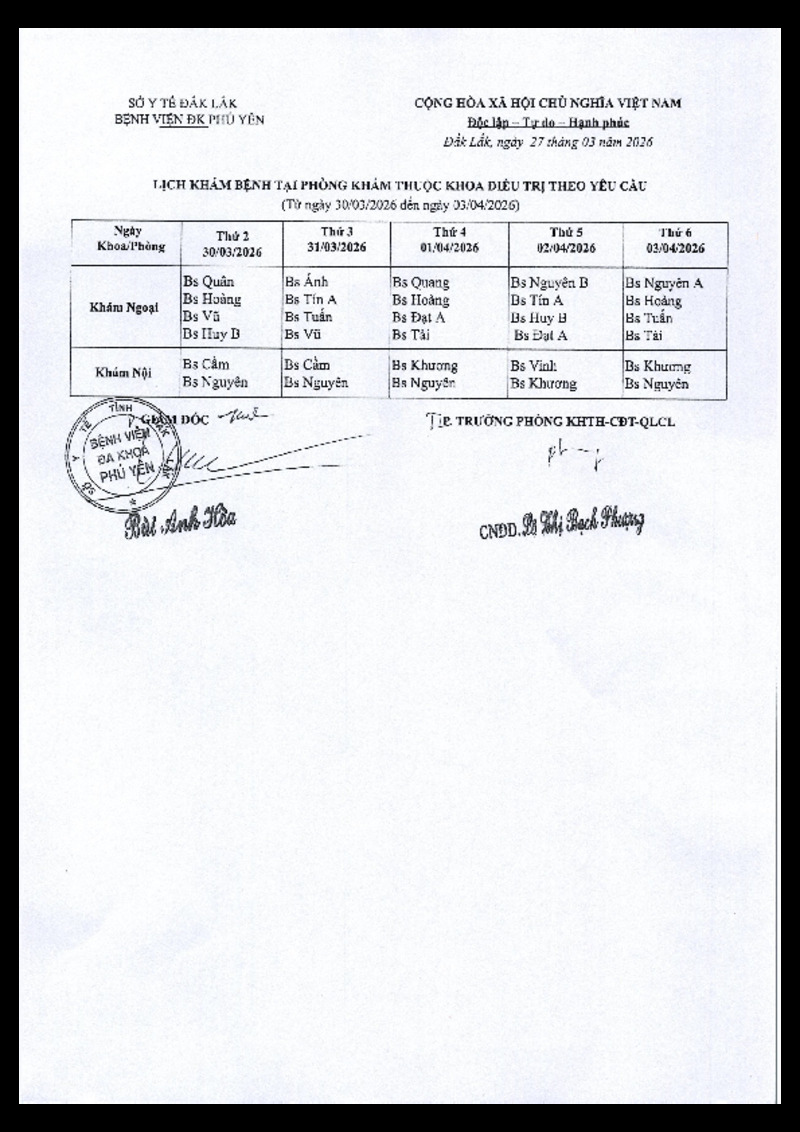 | Tiêu đề văn bản | Lịch khám bệnh tại phòng khám thuộc Khoa Điều Trị Theo Yêu Cầu ( Từ ngày 30/03/2026 đến ngày 05/04/2026) | ||