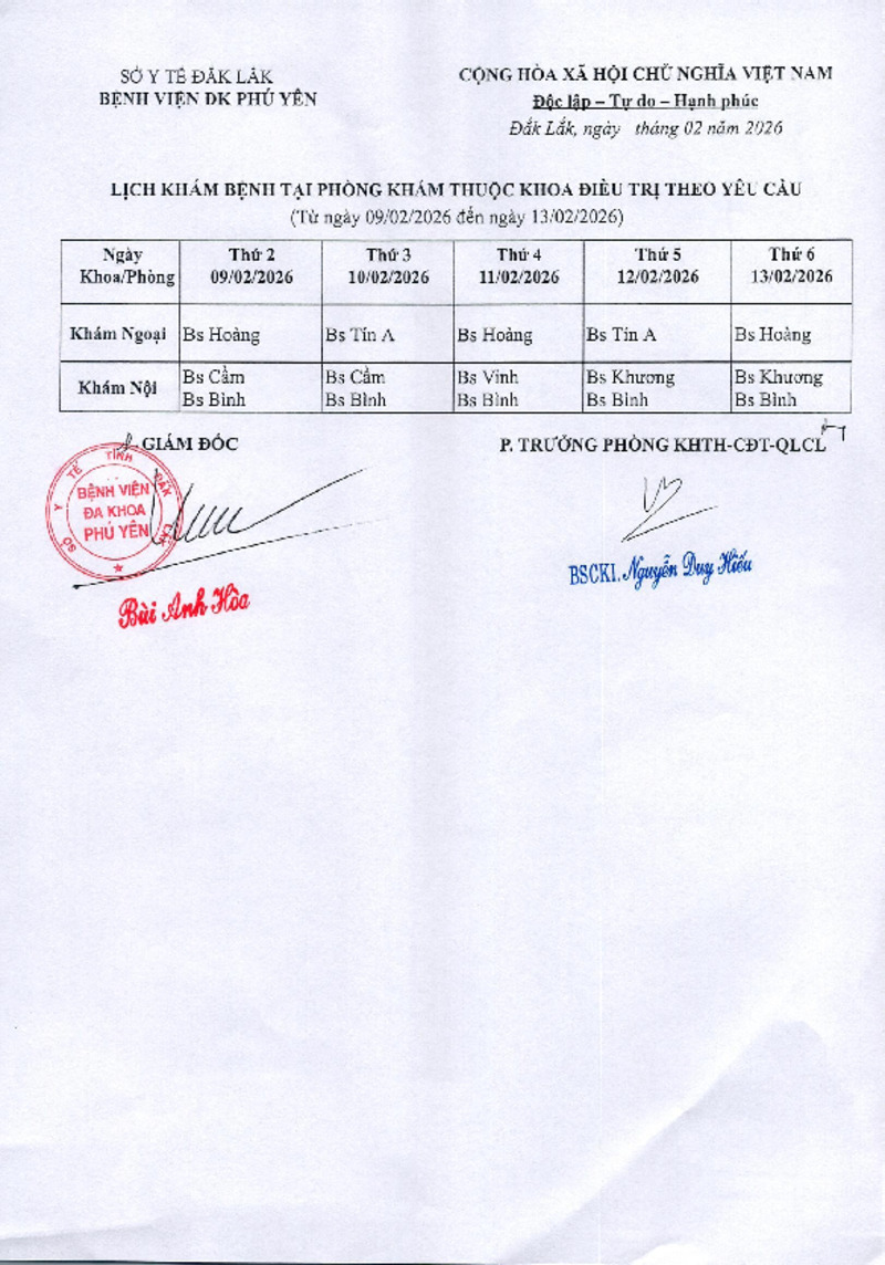 | Tiêu đề văn bản | Lịch Khám bệnh theo yêu cầu trong tuần ( từ ngày 09/02/2026 đến ngày 13/02/2026) | ||