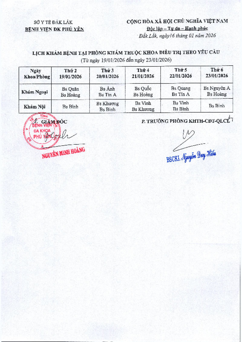 | Tiêu đề văn bản | Lịch Khám bệnh theo yêu cầu ( Từ ngày 19/01/2026 đến ngày 25/01/2026) | ||