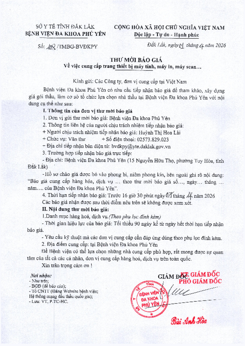 | Tiêu đề văn bản | Thư mời báo giá số 108/TMBG-BVĐKPY Về việc cung cấp trang thiết bị máy vi tính, máy in, máy scan... năm 2026 | ||