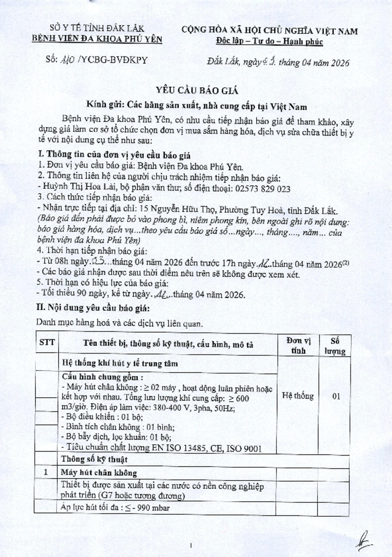 | Tiêu đề văn bản | Thư mời báo giá số 110/TMBG-BVĐKPY Về việc cung cấp hệ thống máy hút trung tâm | ||