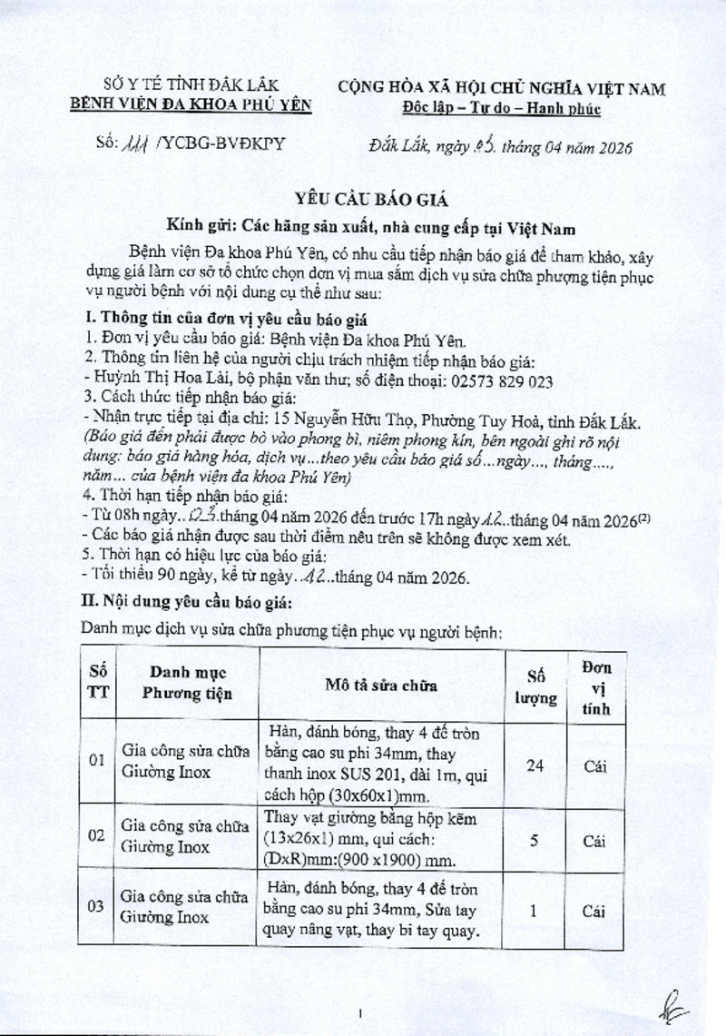 | Tiêu đề văn bản | Thư mời báo giá số 111/TMBG-BVĐKPY Về việc cung cấp dịch vụ sửa chữa phương tiện phục vụ người bệnh | ||