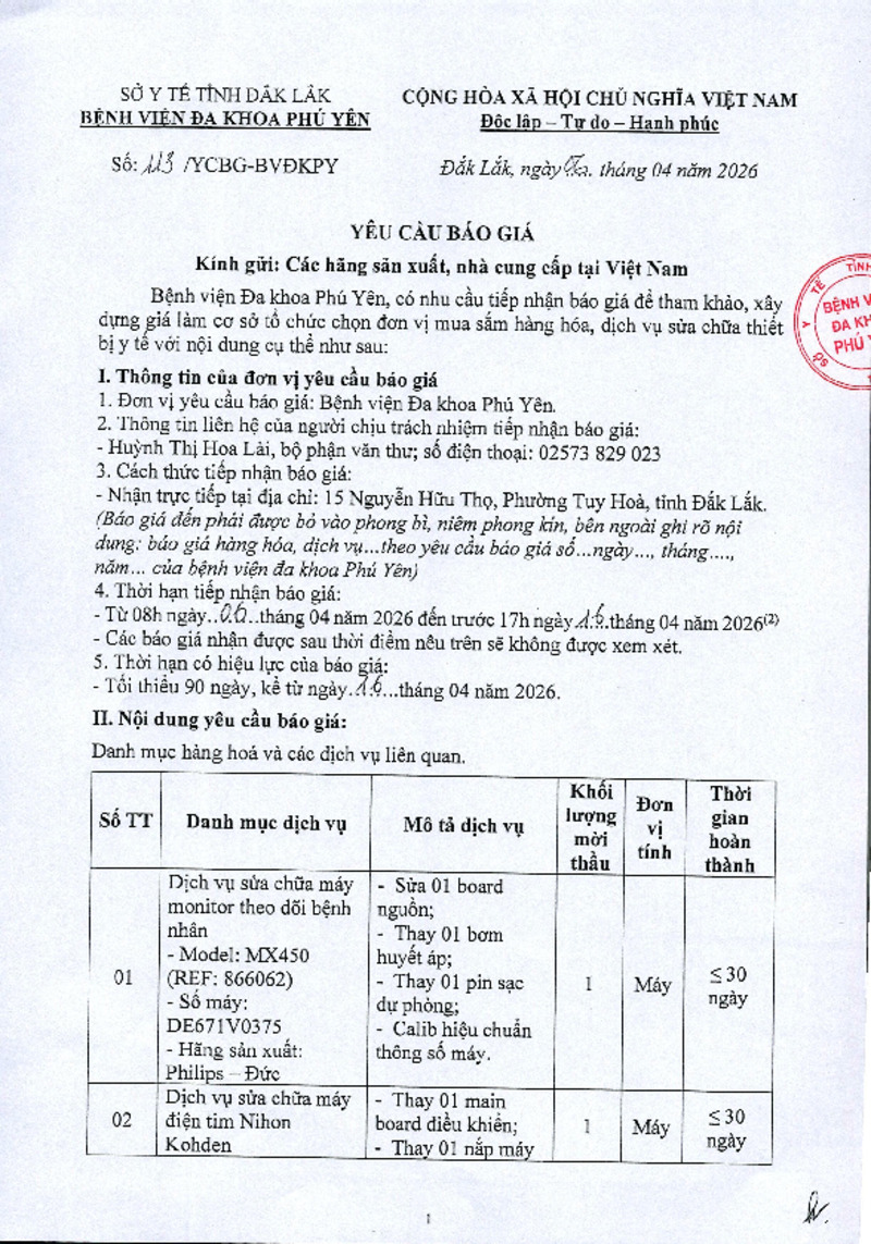| Tiêu đề văn bản | Thư mời báo giá số 113/TMBG-BVĐKPY Về việc cung cấp dịch vụ sửa chữa monitor, máy điện tim, bơm tiêm điện | ||