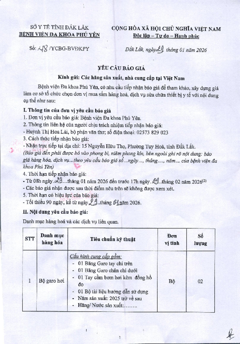 | Tiêu đề văn bản | Thư mời báo giá số 48/ YCBG-BVĐKPY Về việc cung cấp vật tư dụng cụ y tế | ||