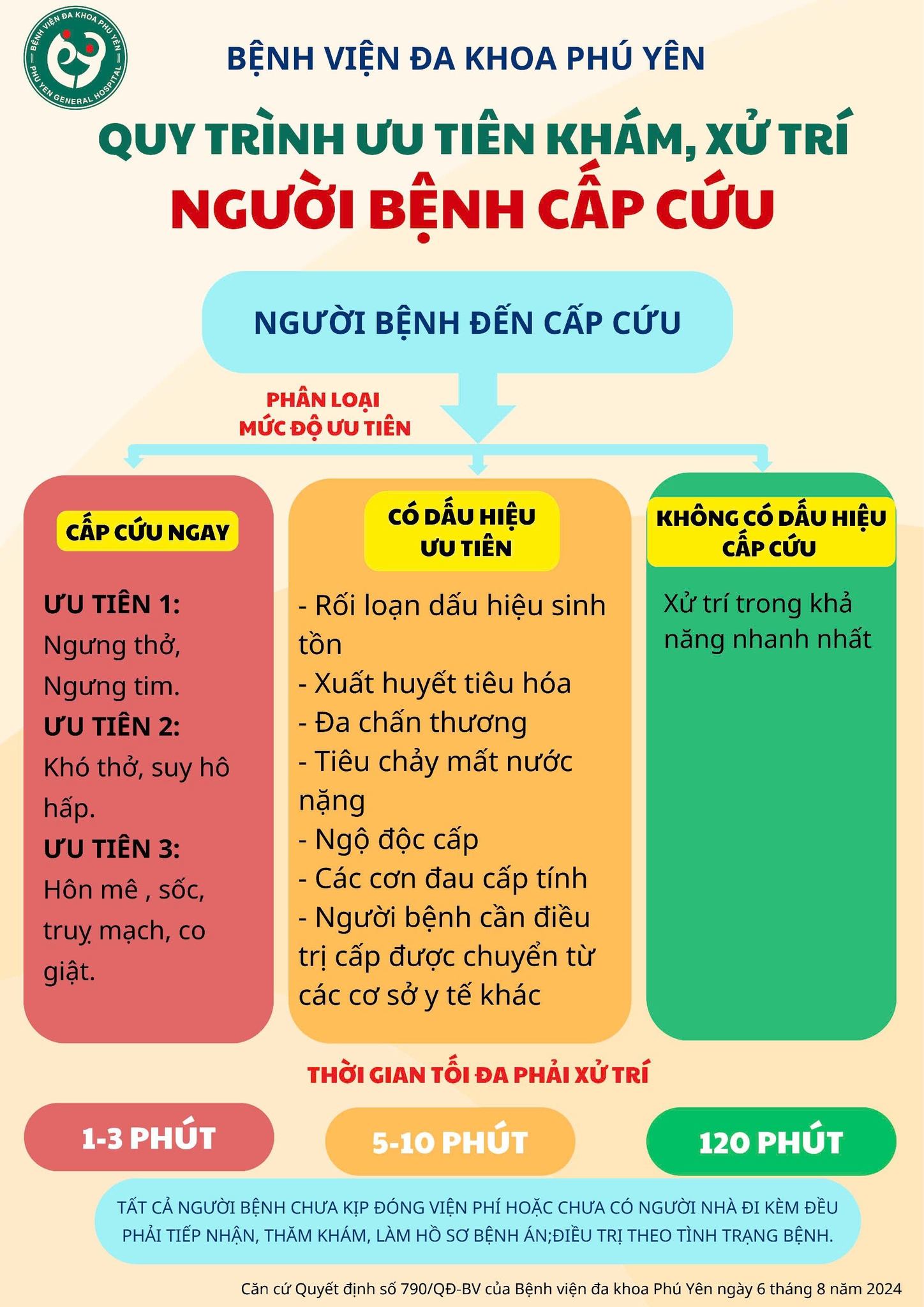 Bệnh viện Đa khoa Phú Yên xin thông báo và phổ biến Quy trình Phân loại và Ưu tiên Khám, Xử trí người bệnh cấp cứu để đảm bảo mọi người bệnh được can thiệp kịp thời, đặc biệt là các trường hợp nguy kịch.
