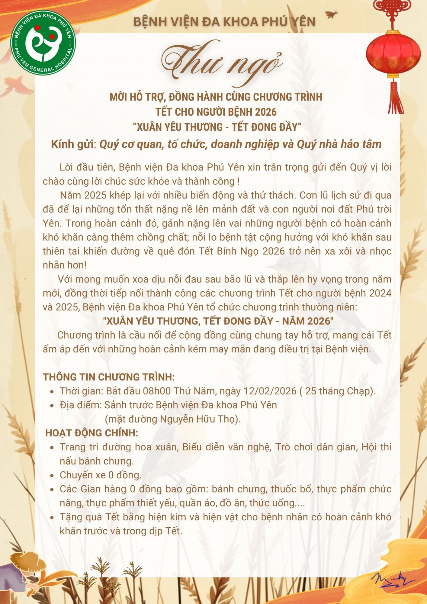 Thư ngỏ mời đồng hành cùng chương trình Tết cho người bệnh 2026 "XUÂN YÊU THƯƠNG, TẾT ĐONG ĐẦY"